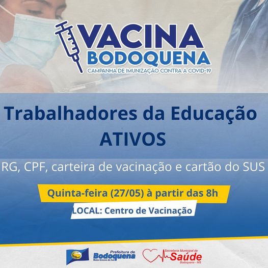 Trabalhadores da educação ativos de Bodoquena serão vacinados nesta quinta-feira (27) em mais uma etapa da campanha de imunização da cidade. Segundo a Secretaria de Saúde, os profissionais devem comparecer no Centro de Vacinação contra da Covis-19 das 8 horas às 11 horas.
