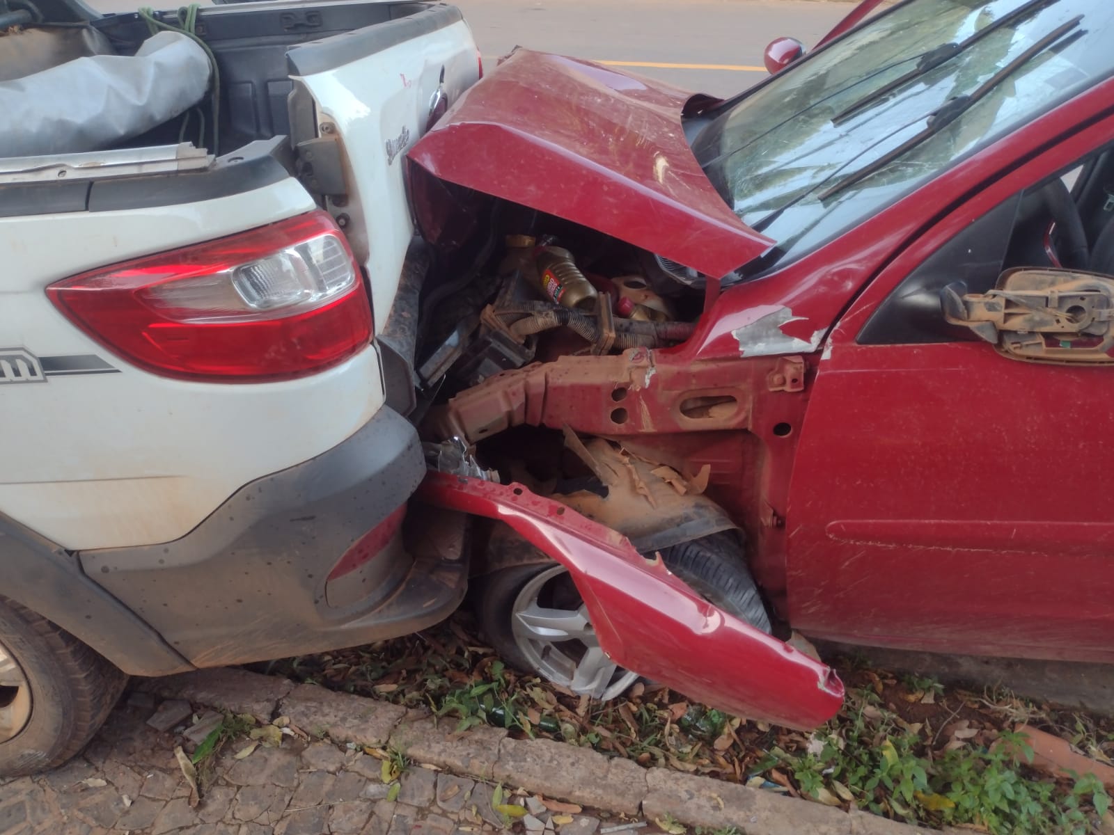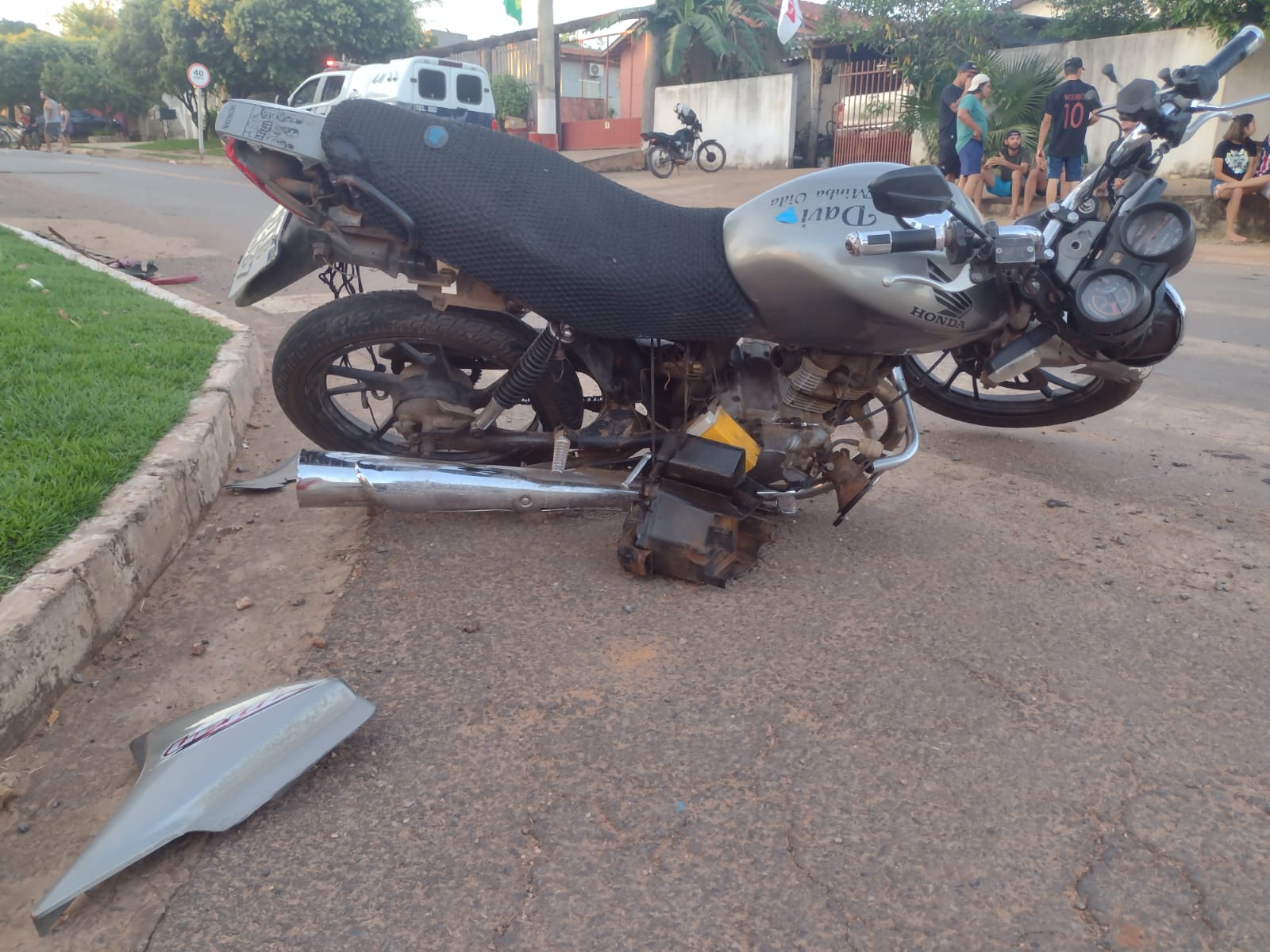 A Policia Militar de Bonito informou que acidente aconteceu no cruzamento das ruas Olivio Flores com Monte Castelo e que a moto bateu no carro vermelho, fazendo com que na sequencia, o veículo atingisse a picape. O motorista estava desorientado. Ele bateu com a cabeça contra o volante e se queixava de dores no pescoço e na perna, devido a um corte. O veículo que conduzia ainda colidiu contra uma picape, que estava estacionada na calçada.
